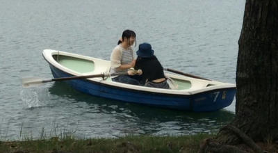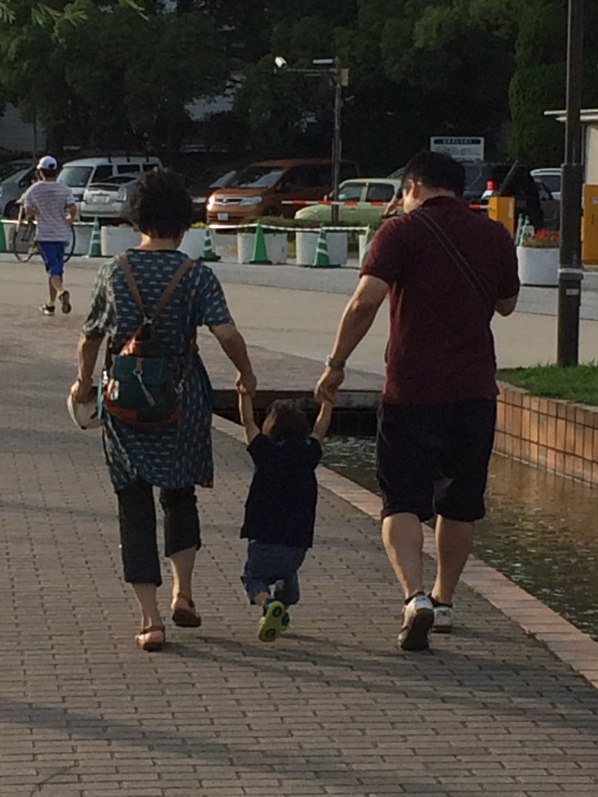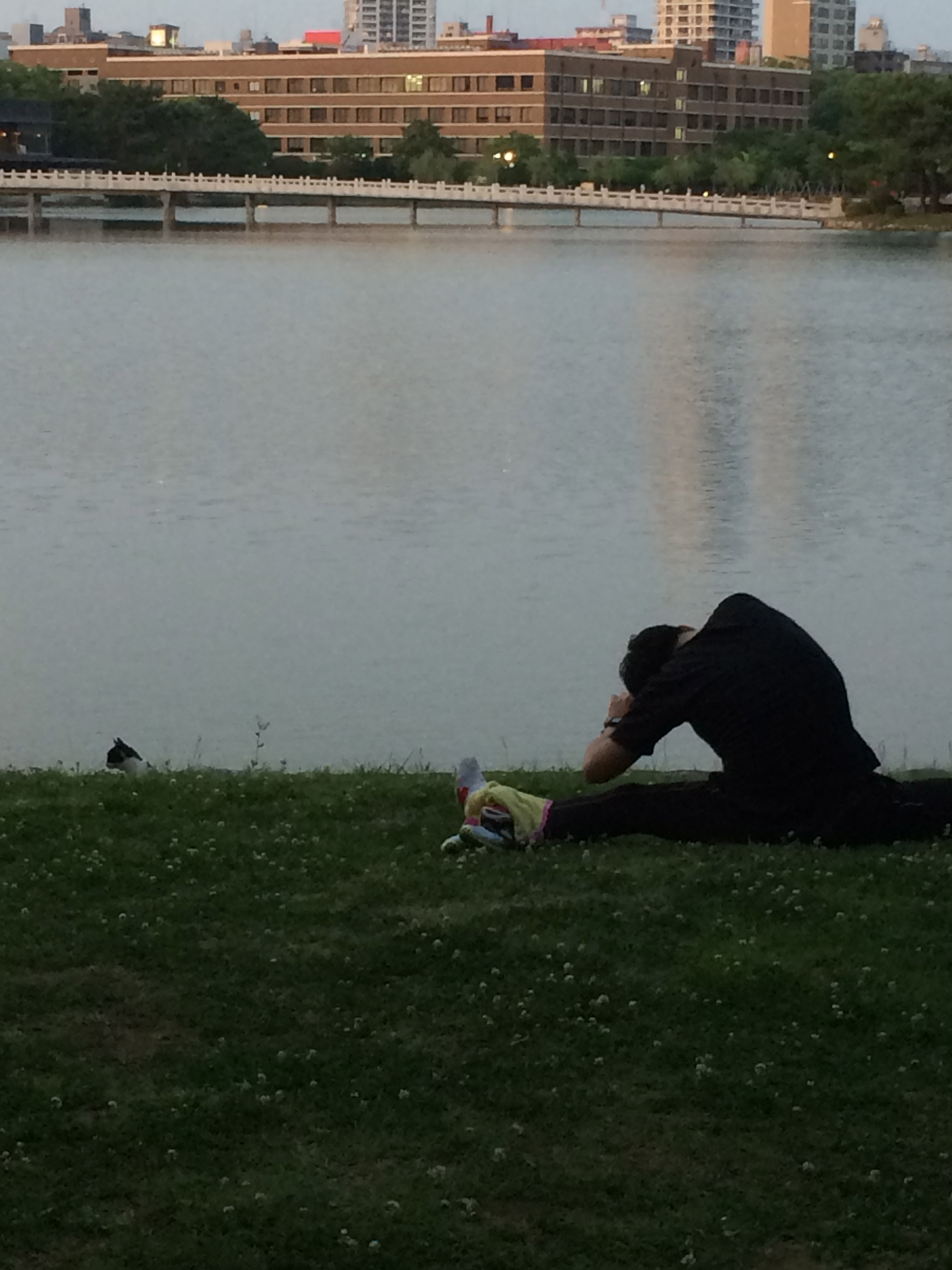 大濠公園のボートの上で黄昏れているカモ、夕日の中ストレッチしている人の横でくつろいでいるネコや仲良く帰路に着く家族三人・・・